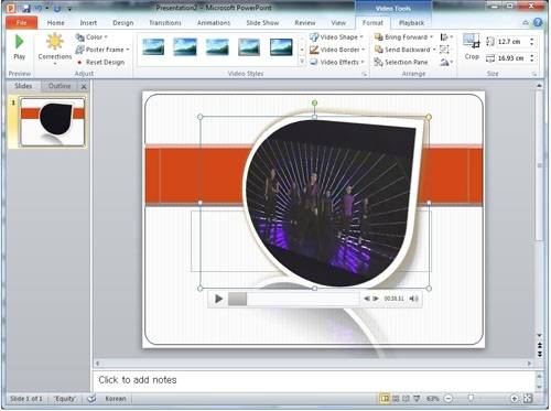 윈도로그( http://blog.naver.com/daehwa777) 김대화 블로거 역시 첫 마디는 '만족스럽다'는 반응. 가장 눈에 띄는 기능으로는 파워포인트에서 개선된 동영상 기능이었다고. 유튜브나 블로그에 첨부한 동영상 등을 문서에 삽입할 수 있고 동영상 개체에 마치 도형처럼 액자를 거는 효과(그림자, 반사, 네온, 3D)를 적용할 수 있다.