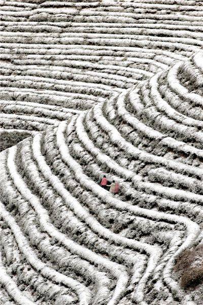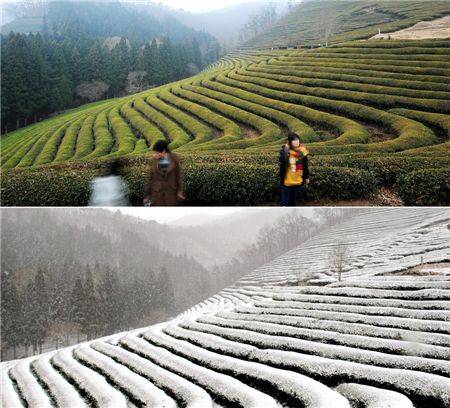 하얀 눈발이 날리는 차밭 계단을 오르자 하얀 솜이불을 깔아 놓은 듯한 차밭이 곡선을 그리며 파도처럼 일렁인다. 산비탈을 가득 메운 녹색 차나무 위로 사뿐히 내려 않은 눈꽃은 동화 속 풍경을 만든다.