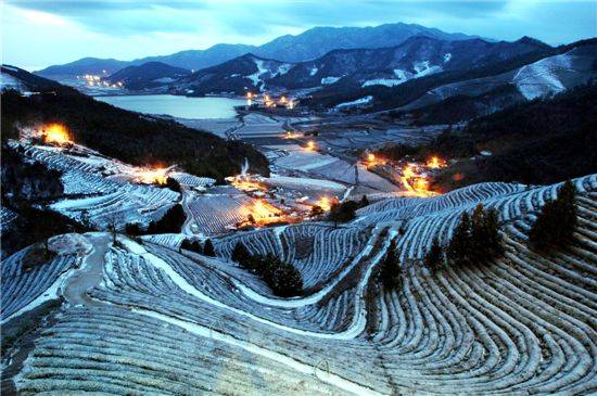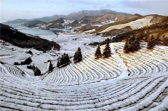 보성 읍내에서 영천리 율포로 이어진 18번 국도를 따라 조성된 35개의 차밭이 연출하는 녹차밭 설경은 한 폭의 그림이다.