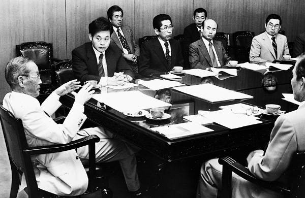 ▲ 1978년 서울 태평로 삼성 본사 회의실에서 해외사업추진회의를 주재하고 있는 호암 이병철 회장. 바로 앞에서 이건희 전 삼성그룹 회장이 호암을 보면서 경청하고 있다. |