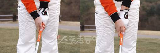 평소에 스트롱 그립(사진⑤) 을 잡는 골퍼라고 하더라도 어프로치 땐 스퀘어 그립(사진⑥)으로 변환해 주는 게 좋다. 스트롱 그립으로 스윙하면 볼이 떨어지면서 왼쪽으로 휘어지는 샷이 자주 나오는 실수를 하게 된다. 손목의 사용을 최대한 억제하면서 부드럽게 스윙할 때 정확한 거리와 방향성을 맞출 수 있다.