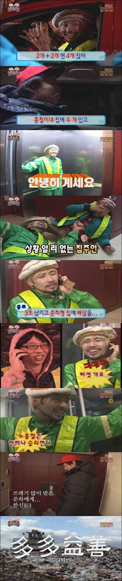 '뚱보연합' 정형돈과 함께 순진하게 함께 하며 끝까지 마음 졸였던 정준하는 집 앞에서 자신을 기다리고 있던 쓰레기봉투 6개에 망연자실, 노홍철 앞에 무릎을 꿇으며 숨막히는 3시간여의 게임을 마쳤다. 그를 기다리고 있을 '쩌바타' 벌칙은 오는 23일 공개될 예정이다.