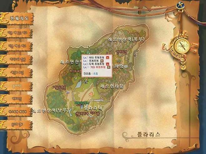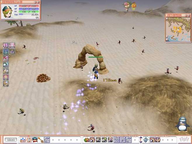 준비가 끝나면 플라리스의 각 지역을 돌아다니면서 몬스터를 사냥해 주는데, 대략 캐릭터의 레벨보다 3~5레벨 높은 몬스터 중 가장 경험치를 잘 주면서도 HP관리에 용이한 몬스터를 사냥해준다. 몬스터의 레벨은 M을 누르면 확인할 수 있는 전체 맵의 몬스터 탭을 통해 확인할 수 있다.