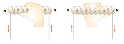 우리가 만든 전자석도 이러한 원리를 이용한 것입니다. 자석은 N극과 S극이 있는데 전자석의 N극과 S극은 어디일까요? 전자석은 에나멜선을 감는 방향에 따라 N극과 S극이 결정됩니다. 아래 그림처럼 말이죠. 이것을 앙페르의 오른 나사 법칙이라고 합니다.