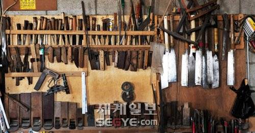◇경기 남양주시 수동면에 위치한 소목장 김창식씨의 작업실. 대패, 칼, 자 등의 작업도구에서 그의 세월이 고스란히 배어 나온다. |