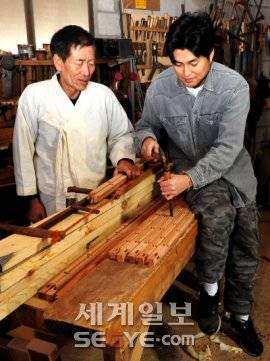 ◇소목장 김창식씨의 희망은 많은 제자를 양성하는 일. 5년간 전수장학생으로 있는 아들 김영환씨에게 김씨가 나무에 끌구멍 파는 작업을 가르치고 있다. |