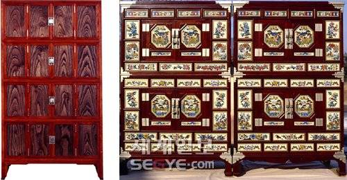 ◇(사진 왼쪽)나무 무늬가 살아 있는 사층책장. (사진 오른쪽) 소목장 김창식씨가 가장 아끼고 내세우는 이층장. 대표적 전통가구로 짜임새가 뛰어나다. |