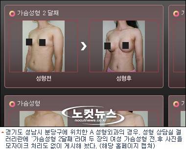 경기도 성남시 분당구에 위치한 A 성형외과의 경우, 성형 상담실 갤러리란에 '가슴성형 2달째'라며 두 장의 여성 가슴성형 전.후 사진을 게시해 놓았다.