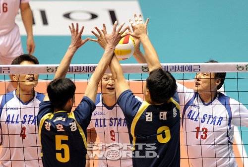 프로배구 코칭스탭 남자팀의 강만수(왼쪽)가 7일 장충체육관에서 열린 NH농협 2009-1010 V리그 올스타전'에서 식전행사로 진행된 여자팀 코칭스탭과의 경기에서 상대 블로킹을 뚫고 스파이크를 하고 있다./장충체육관=김두홍 기자 kimdh@sportsworldi.com |