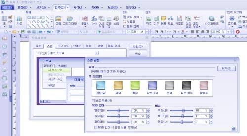 한컴오피스 2010은 스킨의 색상을 변경할 수 있는 기능을 제공한다. [사용자 설정-스킨-고급-색 조정]에서 다양한 색상의 스킨을 사용자 취향에 따라 선택할 수 있어 새로운 화면색을 사용할 수 있다.