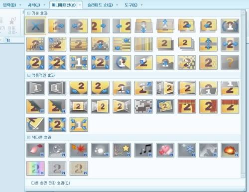 각 효과를 기본 효과, 역동적인 효과, 색다른 효과로 분류하고 화면전환 방향을 세분화하였으며 화면 전환 속도를 세부적으로 설정할 수 있도록 기능을 개선했다.