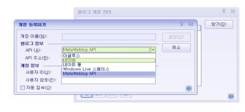 [계정선택] - [블로그 계정관리] 를 선택하여 블로그 주소 및 ID/Password 입력한 후 블로그 계정 등록이 완료되면 현재 작성 중인 문서를 [블로그로 올리기] 메뉴를 통하여 해당 블로그에 등록할 수 있다.