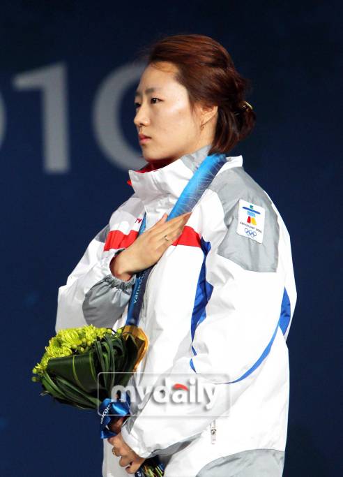 [마이데일리 = 김용우 기자] 18일 오후(한국시각) 캐나다 밴쿠버 BC플레이스에서 열린 스피드스케이팅 여자 500m 시상식서 금메달리스트 이상화(한국체대)가 가슴에 손을 얹고 애국가를 듣고 있다. [사진제공 = 대한체육회]