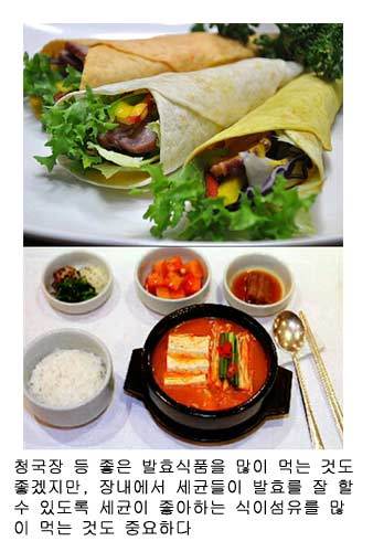 가장 먼저 떠오르는 것은 좋은 균을 많이 먹는 것이다. 김치나 요쿠르트가 도움이 될 수 있다. 하지만 더욱 중요한 것은 장내환경을 좋은 균이 잘 자랄 수 있는 환경으로 바꿔 주는 것이다. 비피더스균이나 유산균이 좋아하는 음식을 많이 먹으면 저절로 이런 균들이 장속에서 무럭무럭 자라게 되는 원리다.