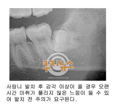 한편 사랑니 발치는 치과의사들로부터 추천을 받은 치과에서 뽑거나 그래도 석연찮을 경우 치과대학병원을 이용하는 것도 발치 시 문제를 최소화하는 방법이다. 국민일보 쿠키뉴스 조규봉 기자 ckb@kmib.co.kr