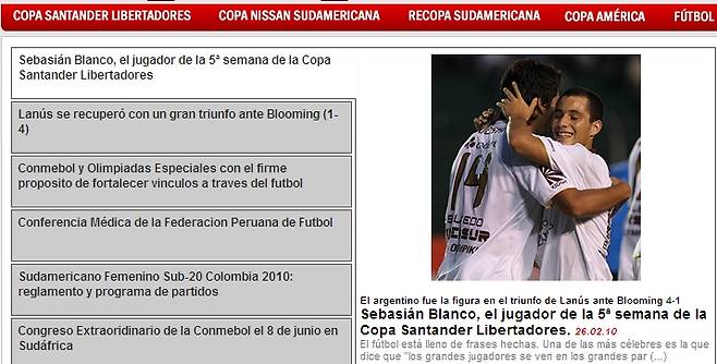 - 코파 리베르타도레스 2월 넷째 주 주간선수에 선정 [엑스포츠뉴스=윤인섭 기자] 코파 리베르타도레스 2010 2월 넷째 주 주간선수로 라누스의 측면 미드필더 세바스티안 블랑코가 선정됐다. 블랑코는 지난 달 26일(이하 한국시각) 있었던 볼리바아 클럽 블루밍과의 코파 리베르타도레스 2010 조별리그 4조 3차전 원정경기에서 1골 1도움의 맹활약을 펼쳤다. 0-1로 뒤지고 있던 전반 24분에는 강력한 헤딩으로 팀의 동점골을 만들었고 후반 30분에는 상대 수비진을 허물어뜨리는 날카로운 패스로 디에고 라고스의 그림 같은 득점에 일조했다. 그 밖에 빠른 돌파로 블루밍의 오른쪽 라인을 초토화시켰고 넓은 시야로 전방의 공격수들에게 수많은 득점 기회를 제공했다. 1988년생으로 올해 나이 불과 21세에 불과한 블랑코는 2005-06시즌 후기리그에 현 소속팀 라누스의 프로선수로 데뷔했다. 2007-08시즌부터 자신의 재능을 입증하기 시작, 소속팀의 주전선수로 발돋움했다. 168cm의 단신이지만 공을 다루는 기술이 좋고 순간 판단력이 우수하다. 매 경기 번뜩이는 재치로 상대 수비수를 놀라게 만드는 영리한 선수이다. 2009년 5월에는 파나마와의 국내파 평가전을 통해 대표팀 레벨의 경기에도 데뷔했다. 팔레르모의 하비에르 파스토레, 벨레스의 막시 모랄레스와 더불어 아르헨티나에서 가장 촉망받는 공격형 미드필더 중 하나로 손꼽힌다.