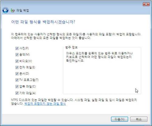 실제 백업에 걸리는 시간을 알아 보려고 7.4GB 이상의 여러 가지 종류의 데이터 파일을 하드디스크에 저장하고 백업했다. 백업 파일 종류를 선택하는 부분에서 [기타 파일]을 선택하면 임시 파일을 제외한 모든 파일을 백업한다. 이 옵션을 선택하면 하드디스크에 저장된 데이터를 모두 백업하므로 데이터 파일이 백업되지 않을까 걱정할 필요는 없다.