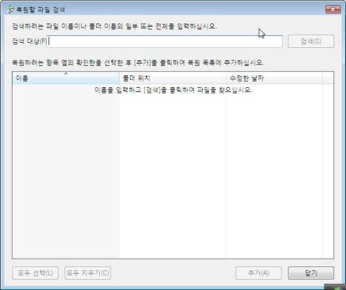 파일이나 폴더를 골라 복구할 수 있는데 원하는 파일이 어디에 있는지 모를 때 [검색]을 눌러 찾는다. 복원할 때는 원본이 있던 폴더에 복구하거나 다른 위치를 선택한다. 비스타와 마찬가지로 원래 위치에 복원할 때 중복되는 파일이 있으면 덮어쓰거나 이름을 바꿔 저장하면 된다.