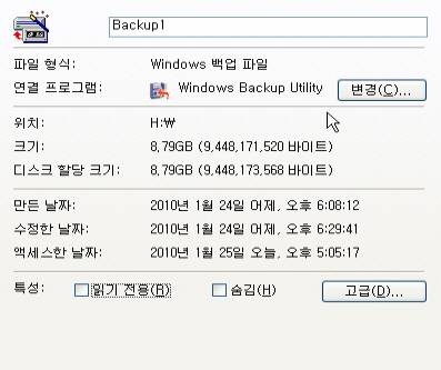 ■ 백업 파일과 백업 시간백업한 파일은 bkf(backup file)라는 확장자로 저장된다. 백업하려는 데이터 용량이 그대로 백업 파일의 용량이 되므로 저장 공간을 많이 차지한다. 윈도 XP의 백업 파일은 윈도의 백업/복구 프로그램에서만 읽을 수 있다. 상위 버전인 윈도 비스타와 7도 XP에서 백업한 파일을 읽어 복구할 수 있다. 단 아무 PC에서나 읽을 수 있어 보안에는 취약하다.