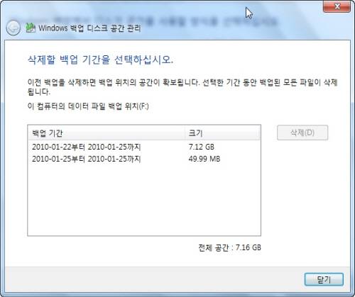 [공간 관리]는 비스타에는 없던 새로운 기능이다. 윈도 7의 백업은 중복 파일을 백업하지 않지만 계속 백업을 하면 용량이 점점 커진다. 백업 드라이브에 용량이 부족하면 알아서 오래된 데이터부터 삭제한다.