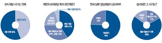최근 남북한을 둘러싼 대화 문제는 크게 6자회담과 정상회담으로 나뉜다. 그중 6자회담은 북한의 어려운 경제사정 등으로 연내 성사 가능성이 높은 것으로 평가받는다. 실제 설문 결과 전문가 41인 중 18명(44%)이 5월 전 회담이 열릴 것으로 내다봤다. 5월 이후 개최될 것이라는 의견은 23명(56%)이었다. 북한이 6자회담에 참여할 수 있도록 돕는 유인책에 대한 질문에서는 북미 직접대화와 제재조치 완화를 꼽는 전문가들이 많았다. 북미대화가 필수적이라는 견해가 17명(41%), 제재완화가 14명(34%)이었다. 평화협정 논의(8명)와 식량지원(2명)은 상대적으로 낮았다.