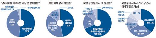붕괴가 현실로 다가왔을 때를 대비해 취해야 할 조치에 대해서도 1순위로 한미공조가 꼽혔고 다음으로 경제협력, 통일기금 조성 등의 순이었다. 한미공조를 튼튼히 해 국제사회에서 북한 붕괴 시 남한의 영향력 확대를 승인받는 것과 동시에 경제협력과 통일기금 확대 등을 통해 북한에 대한 영향력을 높여야 한다는 의미로 해석된다.