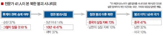 김정일 위원장의 유고 시에도 현 북한 체제가 그대로 유지될까. 일각에서 끊임없이 북한 붕괴에 대한 우려와 이에 대한 각종 시나리오가 쏟아지는 이유다. 가능성 여부를 차치하고서라도 당사자인 남한과 미국, 중국 등 주변국들은 여러 시나리오에 대한 대비가 필수적이다. 북한의 체제유지나 평화로운 방식의 시스템 전환, 체제 붕괴까지 모든 가능성이 열려 있는 만큼, 한국 정부의 대응이 달려져야 함은 말할 필요도 없다. 북한 전문가 41인들의 설문조사를 통해 다양한 시나리오를 점검해본다.