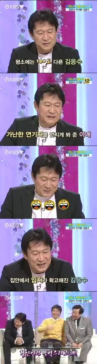 김응수는 3월 4일 방송된 KBS 2TV '박수홍 최원정의 여유만만'(이하 여유만만)에서 오랜 연극활동을 이해해준 아내에게 감사의 뜻을 전하며 "추노 출연 이후 집안의 대우가 달라졌다"고 고백했다.