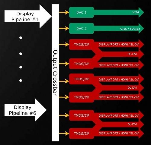 GPU에서 나온 6개 파이프라인은 8개 트랜스미터를 거쳐 최대 6개 모니터에 연결할 수 있다. |