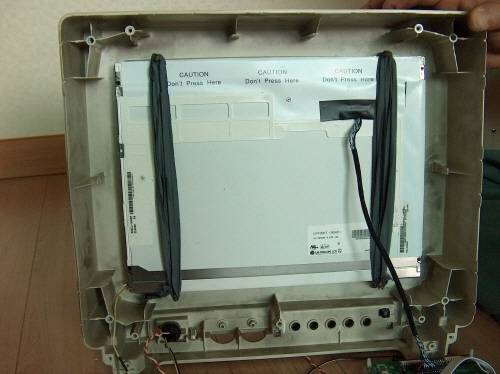 5. 나사를 제거하니 커다란 브라운관이 나타났다. 브라운관은 고압의 전기가 흐르고 있으므로 전원을 연결한 상태로 만지면 매우 위험하다. 전원을 차단한 지 얼마 되지 않았다면 여분의 전기가 남아 있을 수 있으니 절연 장갑을 끼고 만지는 것이 좋다.