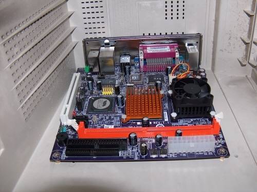 1. 백 패널과 고정용 나사를 이용해 메인보드를 달자. 크기가 작은 비아의 PC-1 ITX 메인보드를 썼다. 내장 그래픽을 얹어 따로 그래픽카드를 달리 않아도 된다.