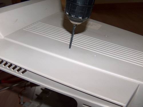 1. D-Sub 케이블과 LCD 어댑터 선을 뺄 통로를 만들어야 한다. 일반 드릴로는 큰 구멍을 내기 어렵다. 드릴에 달아 구멍을 낼 때 쓰는 홀소를 달아야 한다. 전원 케이블을 꽂았던 구멍을 이용하면 굳이 내지 않아도 된다. 이번에는 환기를 위해 일부러 구멍을 냈다.