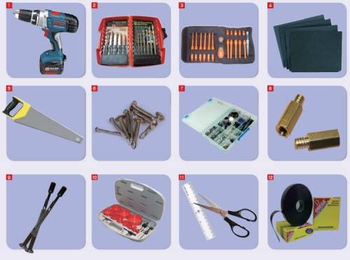 1. 충전용 드릴2. 드릴 날 세트3. 드라이버 세트4. 샌드페이퍼 (사포)5. 가정용 톱6. 3cm 이상의 긴 나사7. PC용 나사, 볼트 세트8. 메인보드 고정 나사9. 육각 렌치나 롱노즈11. 홀소(Hole Saw) 세트12. 절연용 테이프 |