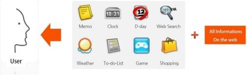 위젯 (Widget)위젯이란 시계와 날씨 환율정보와 같은 특정 기능 또는 유용한 정보와 콘텐츠를 담고 있는 작은 크기의 애플리케이션(Application)으로 사용자가 요구하는 편리한 기능을 제공하는 유용한 유틸리티를 의미한다. 위젯 사용자는 별도의 프로그램 없이 위젯 설치를 통해 유용한 정보들을 블로그, 웹 페이지, PC, 휴대폰 등에서 손쉽게 볼 수 있다. |