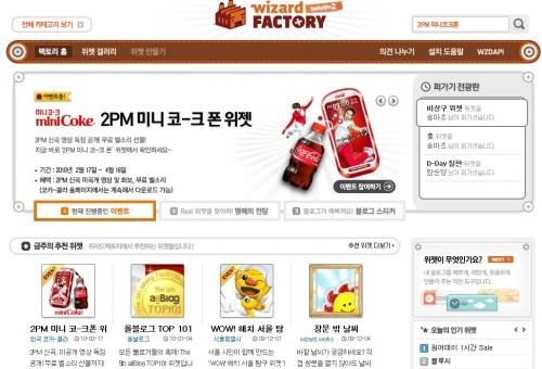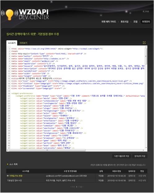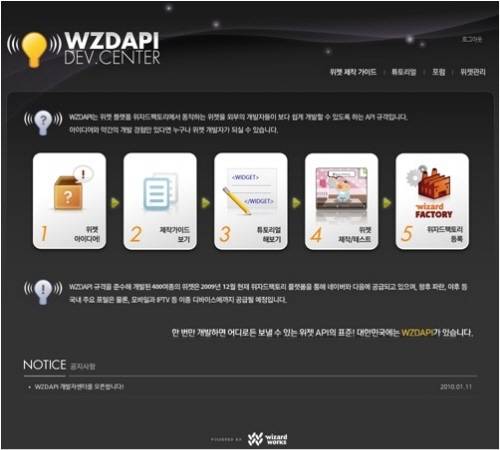■ WZDAPI (위자드 API)국내의 위젯 기술 전문업체인 위자드웍스가 지난 1월 중 런칭한 'WZDAPI(위자드API) 개발자센터' 는 외부 개발자의 위젯 개발을 지원하기 위한 사이트로 어느 정도의 지식만 가지고 있는 유저라면 누구나 자신이 꿈꾸던 위젯을 직접 제작해 볼 수 있는 사이트이다.