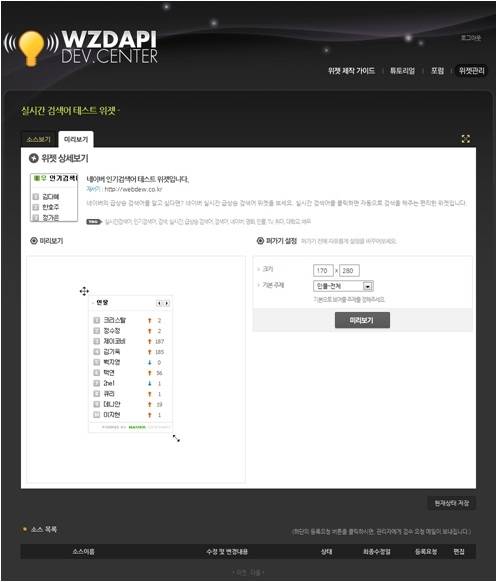 우선 여기서는 코드와 제작이 간단한 편인 실시간 검색어 위젯을 예로 확인해 보도록 하자.-STEP 1 - 필수사항/위젯정보 입력 및 제약사항'위젯제작가이드'에서 설명한 프로세스대로 소스코드와 함께 설명하고 있으며 페이지 상단에는 구체적인 설명 하단에는 실제 코딩 정보를 제공하고 있다.