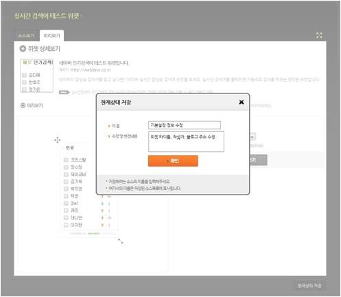 내 위젯 관리메인 페이지의 '내 위젯 관리' 메뉴를 통해서 사용자가 제작한 위젯을 관리할 수 있다. 해당 페이지의 '위젯만들기' 메뉴를 클릭해 '위젯의 이름'을 입력하는 팝업에서 시작해 실제 위젯 제작에 돌입하게 되며 제작 이후 해당 페이지의 메뉴를 통해서 위젯도 등록할 수 있다.