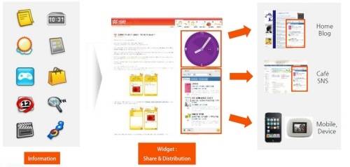 특히 위젯은"원 소스 멀티 유즈(One Source Multi Use)"로 한 번 제작된 위젯은 홈페이지, 카페, SNS, 모바일(Mobile), 디바이스(Device) 등에 맞게 다양한 매체로 담을 수 있다. 이런 위젯은 그 설치 환경에 따라 웹 위젯, 데스크톱 위젯, 모바일 위젯으로 나뉘게 된다.■ 웹 위젯웹 위젯은 HTML 기반의 웹 페이지나 블로그 내에서 단일 기능을 수행하는 삽입과 삭제가 가능한 한 단위의 코드 묶음으로 (by Wikipedia) 사용자가 원하는 기능을 웹 페이지로 쉽게 담아갈 수 있도록 개인화 채널(Contents On Demand)이 된다. 따라서 효과적인 정보전달이 가능하며 사용자의 만족도가 높은편이다.