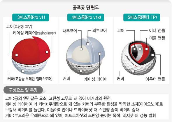 ■ 3피스 대 5피스 미국 테일러메이드는 최근 세계 최초로 5피스 공(펜타 TP)을 출시해 경쟁업체를 긴장시키고 있다. "공을 구성하고 있는 5개 층이 각각 다른 역할과 성능을 발휘해 골퍼에게 최상의 플레이를 선사한다는 것"이 회사 쪽 설명. 핵심 부분인 코어와 겉면을 감싸는 커버 사이에 각각 소재가 다른 세 겹의 맨틀이 들어 있다.