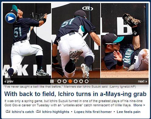 시애틀 지역 신문 '뉴스트리뷴'은 이날 시범경기 최고 플레이로 이치로의 수비를 선정했다.