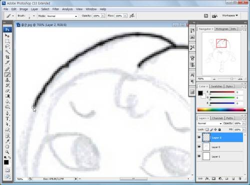 전경색을 검정으로 하고 [브러시 툴]을 고른다. 옵션 바에서 브러시 크기를 2px로 설정하고 밑그림의 윤곽을 따라 그린다. 한 번에 그리는 것보다 조금씩 그리며 연결한다. 만약 실수해 전단계로 되돌아 갈 때는 를 누른다. 여러 단계 전으로 돌아갈 때는 를 누른다.