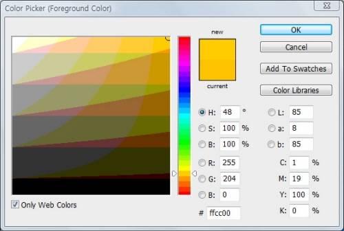 툴박스에서 전경색을 클릭해 컬러 피커(Color Picker) 팔레트를 꺼내고 헥사코드 '#FFCC00'을 입력해 어울리는 색상을 만들고 OK를 누른다. 를 눌러 선택 영역을 전경색으로 채운다.