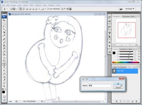 6. 패스 팔레트의 '워크(Work) 패스'를 더블 클릭해 세이브 패스(Save Path) 창을 연다. 창이 열리면 '몸통'이라고 입력하고 OK 버튼을 클릭한다.