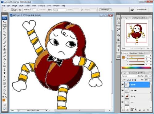 [마술봉 툴]로 '라인' 레이어에서 몸통과 팔다리를 선택영역으로 만들고 '어두운톤' 레이어에서 '다커 레드'보다 좀 더 어두운 색상으로 칠한다. 몸통은 '#330000'으로 팔다리의 어두운 부분의 색상은 '#663300'으로 칠한다.