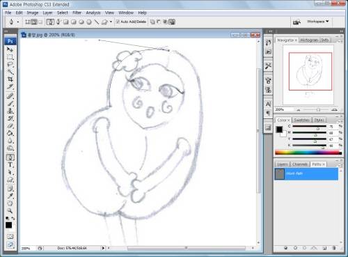 콩군과 마찬가지로 스캔해 놓은 콩양.jpg 파일을 불러온다. [펜 툴]을 선택하고 옵션 바에서 패스(paths)를 골라 몸통의 윤곽 부분을 클릭한다.
