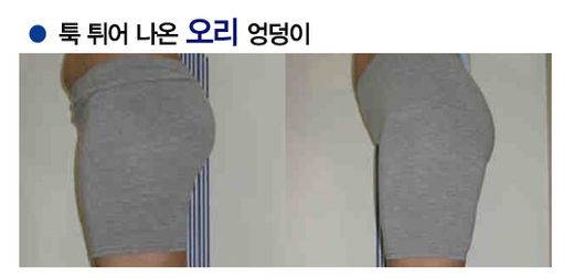 잘못된 생활습관으로 몸의 무게 중심이 앞으로 이동해 골반도 앞으로 기울어지면서 엉덩이만 뒤로 튀어나오는 것이다. 앞으로 쏠린 골반의 위치를 바로 잡으려면 균형을 잃어 약해진 골반 및 척추의 관절과 근육을 강화시키고 딱딱해진 부분을 이완시켜 골반과 척추의 위치를 조정해야 한다.