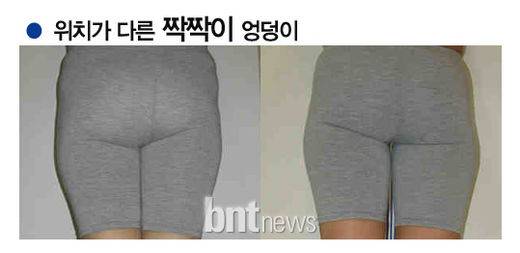 양쪽 엉덩이의 크기와 위치가 서로 다른 짝짝이 엉덩이는 한쪽 다리만 짚고 서거나 한쪽으로 가방을 매거나 짐을 드는 습관을 가진 사람에게 흔히 나타난다. 무게가 실린 방향으로 골반, 고관절, 척추 등이 기울어지면서 엉덩이 근육이 비대칭으로 발달하는 것이다. 골반, 고관절, 척추의 정렬상태를 확인한 다음 한쪽으로 치우친 부분을 교정해야 한다.