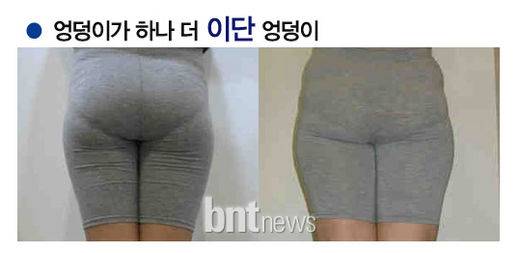 엉덩이 밑에 또 하나의 엉덩이가 있는 것 같은 이단 엉덩이는 비만인 사람에게 많이 나타난다. 고관절이 안쪽으로 과도하게 회전해 몸의 무게 중심이 앞으로 이동하고 골반도 덩달아 앞으로 기울어지면서 뒤쪽에 있어야할 허벅지 살이 바깥쪽으로 돌아가고 허벅지 옆 살이 튀어나오면서 생긴다. 안쪽으로 휜 고관절과 비틀어진 골반의 위치를 바로 잡는 것이 중요하다. 일단 교정을 하면 엉덩이만 예뻐지는 것이 아니라 다리까지 일자로 곧아지는 일석이조의 효과를 얻을 수 있다.