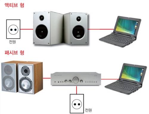 액티브 스피커는 앰프가 안에 들어 있어 PC 사운드 케이블만 꽂으면 된다. 기술이 발전해 액티브 스피커의 성능도 많이 좋아졌고. 설치가 간편해 작곡가, 프로듀서 등 음악 전문가들도 많이 이용한다.