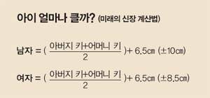 모든 부모의 관심사이다. 시쳇말로 얼짱이니, 몸짱이니 하는 외모에 무관심한 부모도 아이의 키 이야기에는 귀를 기울인다. 아이의 최종 키를 쉽게 예측해볼 수 있는 공식이 있다. 아버지와 어머니 키를 더한 후 2로 나누면 평균치가 나온다. 여기에 6.5㎝를 더하면 남자아이의 최종 키가 된다. 그 평균치에서 6.5㎝를 빼면 여자아이의 최종 신장이다. 예를 들어 아버지 키가 1백80㎝이고, 어머니 키가 1백60㎝라면 부모의 평균 키는 1백70㎝이다. 이 부모의 아들은 1백76.5㎝, 딸은 1백63.5㎝까지 자랄 것으로 예상한다. 아이 신장 예측에 부모의 키를 기본으로 삼은 이유는 유전이 신장에 미치는 비중이 크기 때문이다. 유전적 요인으로는 인종·민족·가계·연령·성별 등이 있다. 유한욱 서울아산병원 소아청소년병원장은 "유전이 키에 미치는 비율은 70%에 이른다. 대체로 부모의 키가 크면 자식도 크다. 성장 장애가 있는 아이를 둔 부모에게 의사가 출생할 때부터 작았는지, 가족이 뒤늦게 크는 형인지, 가족의 키가 본래 작은지를 물어보는 이유도 여기에 있다"라고 설명했다.